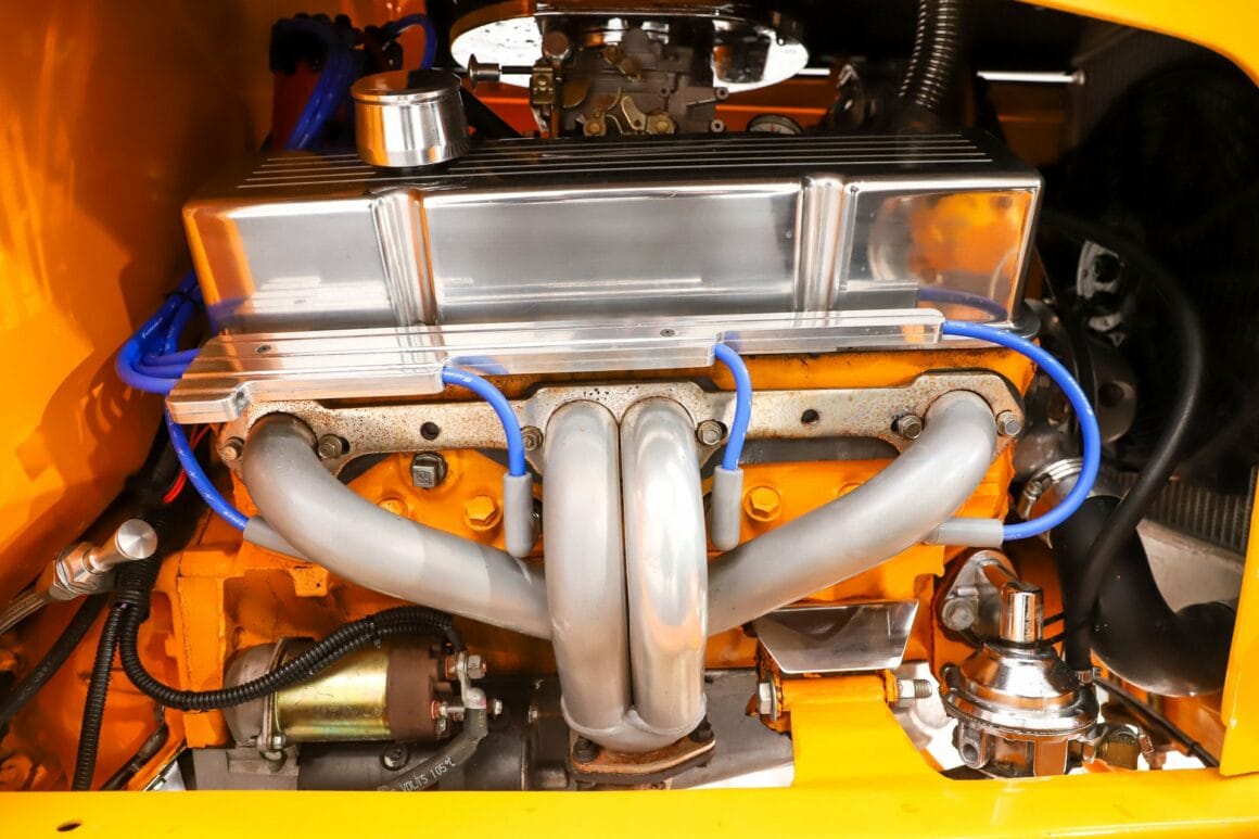 COMPARTIMENT MOTEUR: Le Moteur V8 350ci marche fort et fonctionne. Sur le dessus, il a une prise d’air en aluminium, un carburateur Weber et un système d’allumage MSD. Il dispose également d’un ensemble d’en-têtes enduits, comme habillés pour le bal avec des couvercles de soupapes en aluminium, des porte-fils assortis, un alternateur poli, une pompe à carburant chromée, des jauges billettes et plus encore… Un radiateur en aluminium et une pompe à eau, un ventilateur électrique et une tuyauterie en acier inoxydable le gardent au frais. Il dispose d’un pare-feu fluide…