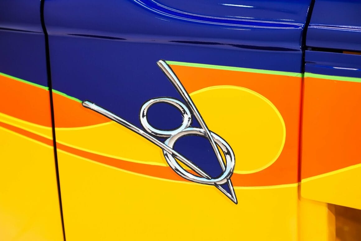 EXTÉRIEUR: Fibre de verre très cool et unique, carrosserie Victoria hachée. La carrosserie est en excellente forme, pas de dégâts, elle est est droite, et s’adapte bien à toutes les morphologies, même déviantes. Les portes s’ouvrent à distance avec un bip. Le travail de peinture est exceptionnel. Les couleurs le font remarquer. Les flammes et le logo V-8 le rendent unique en son genre. La peinture est belle, lisse et brillante! Les vitrages sont neufs. Les clignotants avant et les feux arrière sont des LED intégrés dans des barres d’écartement BDSM recyclées. Il roule sur un ensemble de jantes Torque Thrust de taille décalée et de pneus BFG.