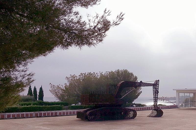 En me promenant à St-Agay entre les Issambres et Fréjus/St-Raphael, mon attention est attirée par une grue Caterpillar en dentelle de Brugge, abandonnée sur un terrain bétonné près de la route côtière…