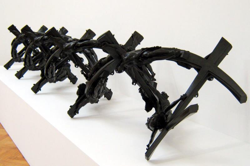 – Le corps suit la croix. C’est la croix qui m’intéresse, cette forme géométrique minimale, très présente dans l’art minimal du 20ème siècle. Aujourd’hui, tout doit suivre cet art minimal. Le corps du Christ suit la torsion que je donne à la croix, il devient collatéral avec la forme de la croix : il s’agit d’une recherche géométrique…