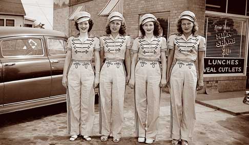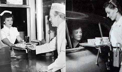 Dans les drive-in les clients sont servis dans leur voiture, d’un drive-in à l’autre les menus sont quasi les mêmes, ce qui les différencie est moins la qualité de la nourriture que les tenues vestimentaires plus ou moins sexy des jeunes serveuses les “carhops“, qui vont de voiture en voiture, parfois en patins à roulettes.