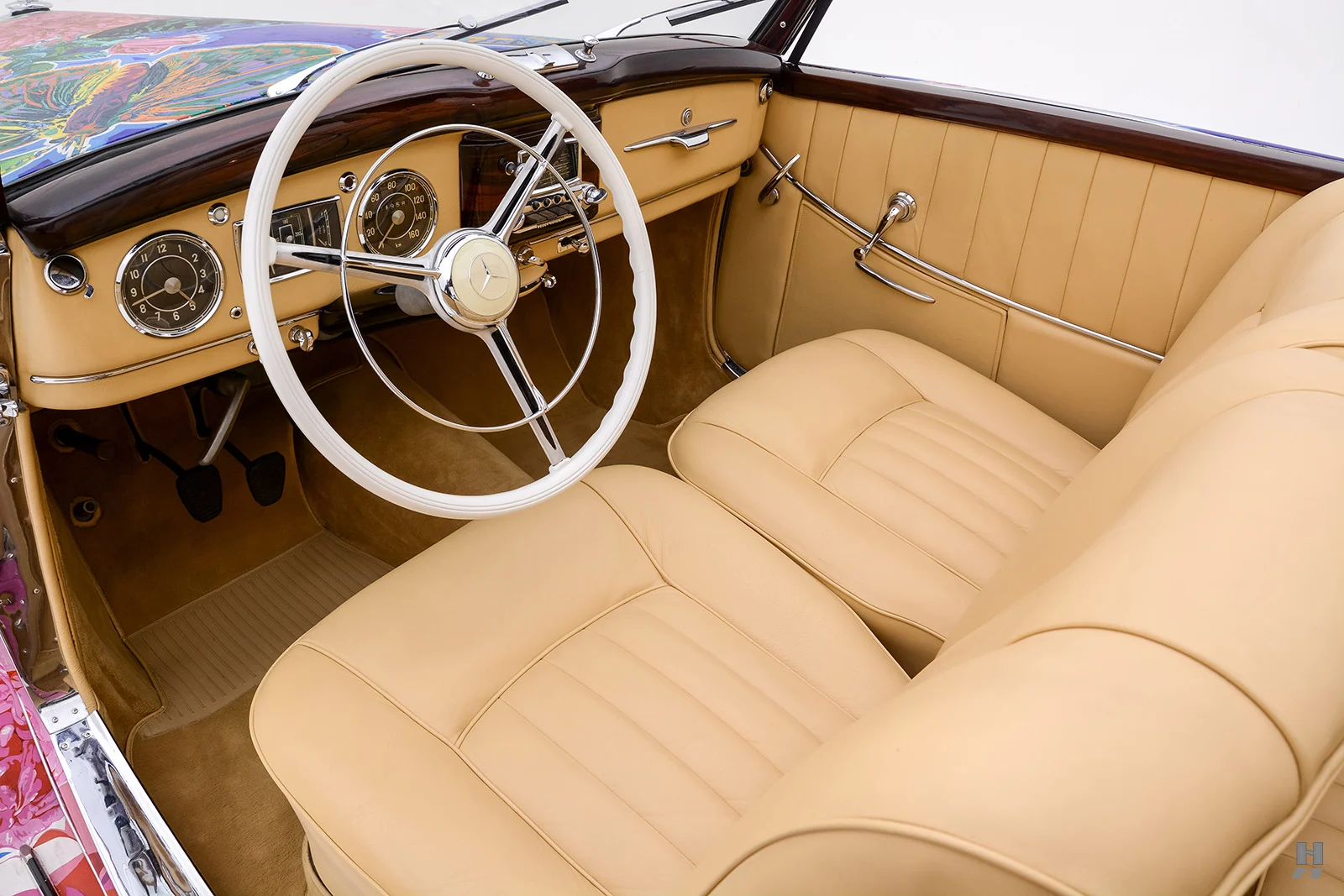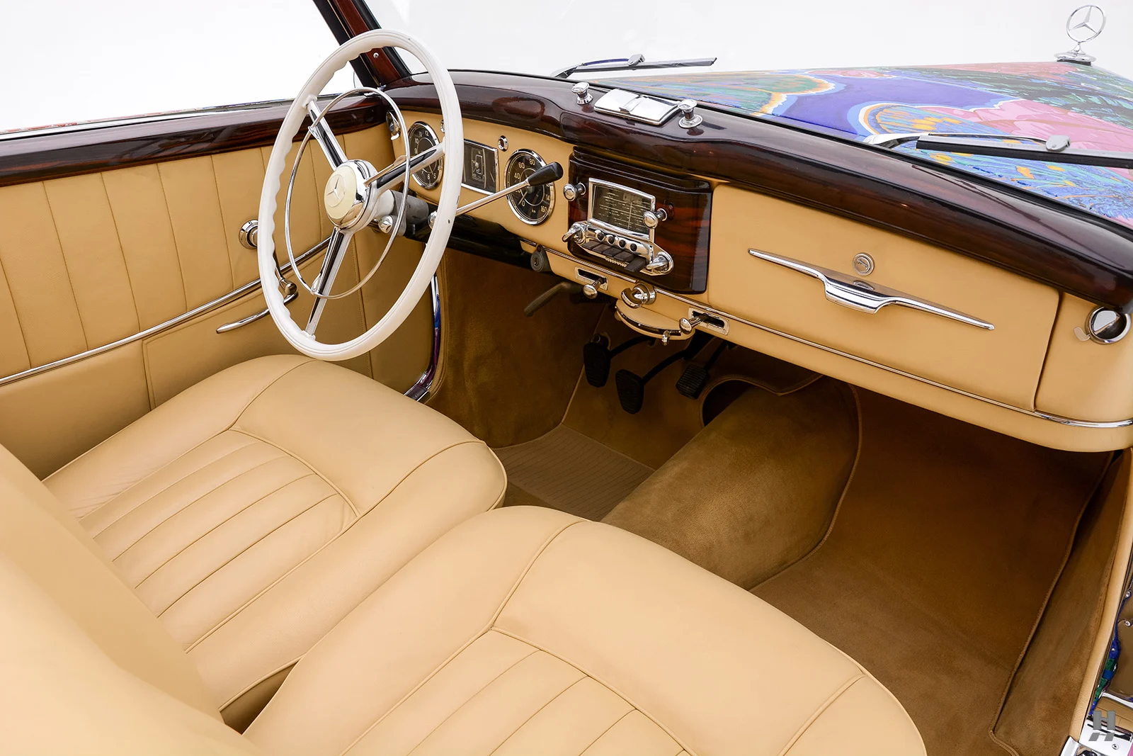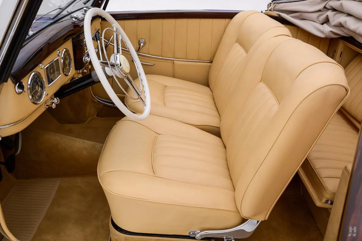 Il eut fallu un cuir bleu en rappel avec le bleu de bas de décor… C’est donc une œuvre d’art roulable vraiment étonnante, à l’habitacle sans aucun rapport de décor, mais basée sur l’un des plus beaux modèles Mercedes-Benz d’après-guerre. Cette Mercedes-Benz 220A Cabriolet A de 1952 n’est qu’une trouvaille pour un riche collectionneur, ex-hippie mais toujours déjanté, faut-il qu’il se fasse convaincre et puisse payer les 260.000 $ demandés…