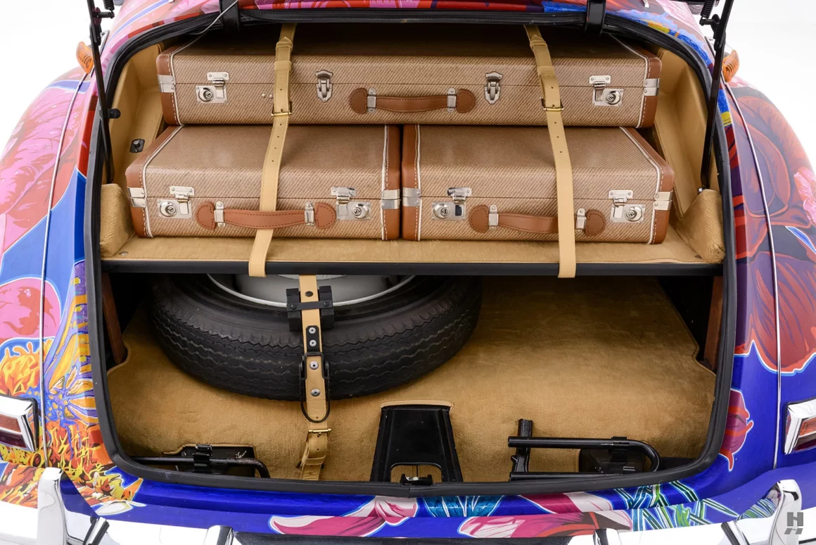 Pour lui, il s’agissait de fusionner les mondes mécanique et naturel. Les éléments inclus avec ce véhicule magnifique ne sont ni un râteau, une pelle, un seau et un sécateur, pas même un arrosoir, mais sont un cric et des outils pour changer de roue en bordure de route en cas de crevaison en pleine nature… ainsi qu’un ensemble complet de bagages parfaitement adaptés mais d’une couleur atroce (comme l’habitacle) absolument pas en rapport avec le décor fleuri !.